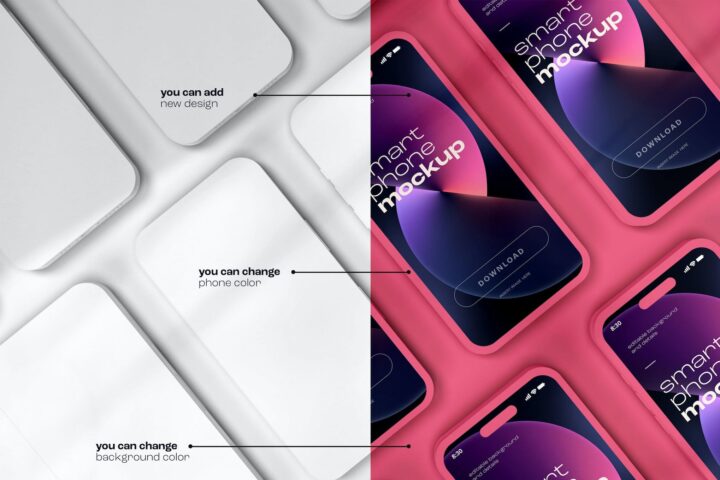 The mockup includes iPhone, a smartphone with fully customizable colors and smart objects. You can use it for social media posts like Instagram, to spice up your portfolio on your website or Behance and dribbble projects.