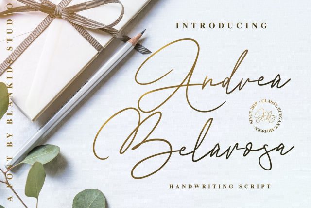 Introducing of our new product the name is Andre Belarosa handwriting script. inspired by signature and stylish handwriting, Andre Belarosa is good for logotype, wedding invitation design, badge, headline, signature, packaging and any more.