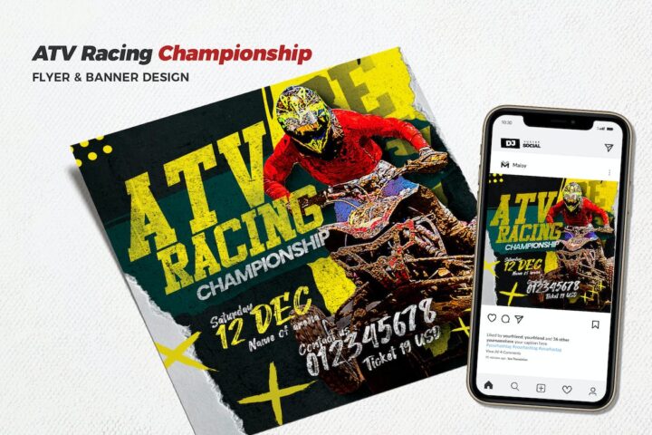 ATV Racing Championship Flyer Creative and modern Instagram template to make your Instagram feed better and stand out. This flyer template perfect for any personal or corporate use. You can easily edit this flyer template. You can change the image with the smart object. You can resize all objects without reducing the image quality.