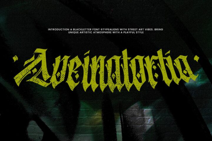 AVEINATORTIA is a blackletter font that has been modified to be more decorative so that it looks more urban or street art. The goal is that it can be used for different urban or street art designs, not just relying on graffiti letters or spray paint. Also suitable for supporting designs for fashion brands, skates and brands that are urban or street art. The presence of several additional ornaments on each letter makes a strong decorative impression.