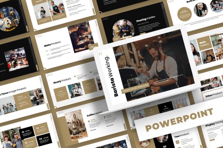Barista Working – Powerpoint Template – with 5th premade color variations Get it now, Barista Working – Powerpoint Template is a great template for business or personal needs with multipurpose presentations. All elements in this template are made with Powerpoint, edit only with Powerpoint, insert your content, replace your images to placeholders, change colors, and all presentations including animated slides and present your slides to your business partners. Happy Sliders !!!