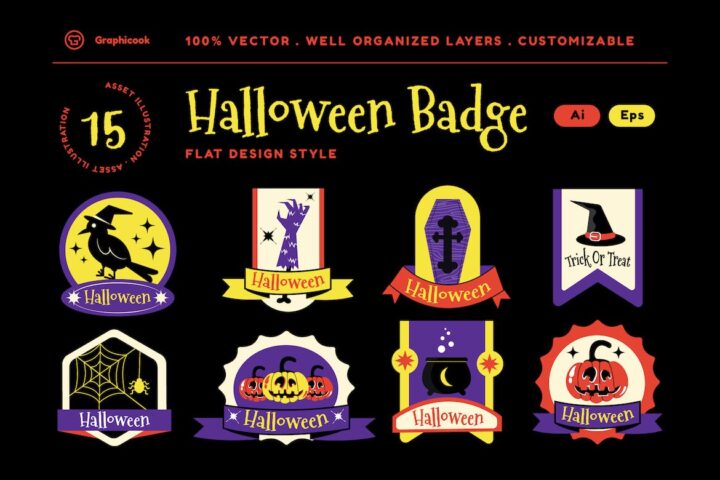 Graphic, Illustration, Vector, Flat design, Website, Ui, Assets, Clipart, Landing page, Halloween, Halloween badges, Tricortreat, Spooky, Creepy,