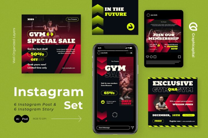 Instagram, Instagram post, Instagram story, Instagram pack, Design, Template, Useful, Modern, Gym, Healthy, Fitness, Exercise, Black, Business,