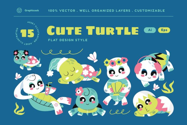 Blue Flat Design Cute Turle Illustrations is an illustration that is excellent for you to create your own scene composition for your upcoming website, apps, landing pages, and presentation page clipart/illustration projects.