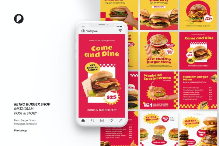 The Bright Yellow Retro Burger Shop Instagram Template provides you with 15 different and unique designs for Instagram posts and stories, available in the PSD format file. This template is adjustable and customizable. You can edit the template’s image, color, and text based on your preference and taste using Adobe Photoshop to fit your needs.