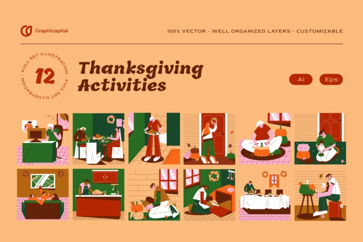 Brown Thanksgiving Activity Illustration Set is an illustration scene that is perfect for your upcoming website, apps, landing page, and presentation page clipart/illustration project, with this you can create your own scene composition.