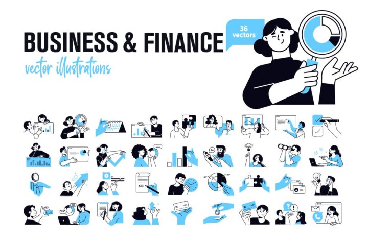 Set of people vector illustrations in various activities of business, management, finance and banking, market research and data analysis, communication.