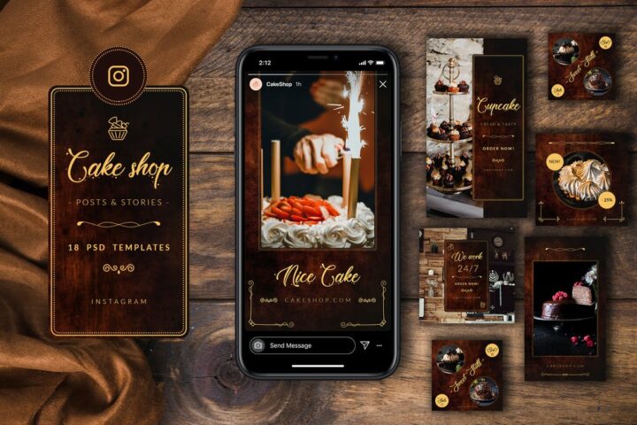Cake Shop Instagram Nice tasty design for confetioners, cake shops and all who need nice design for Instagram post and stories. Chocolate colors, neat ornaments, thin borders. Get 18 PSD templates in one pack!