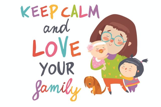Cartoon young mother with her cute children.