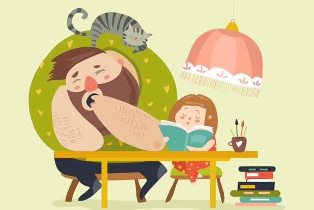 Girl with Dad doing homework. Vector illustration