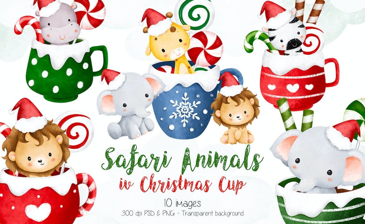 Christmas Safari Animals in Cup Clipart