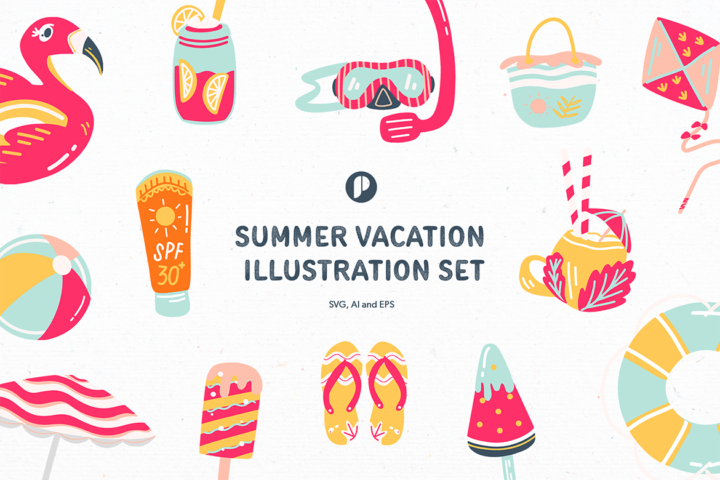 This illustration set consists of 15 iconic summer illustrations in three formats: AI, SVG, and EPS. You can use it on your graphic project using the suitable and comfortable application you usually use. You can duplicate as many as you want or resize the item as small or as big as you need. This illustration set is very easy to use, and you will not have any significant difficulties when using it.