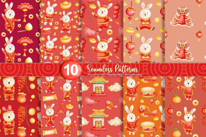 10 Chinese New Year Rabbit Zodiac Seamless Pattern