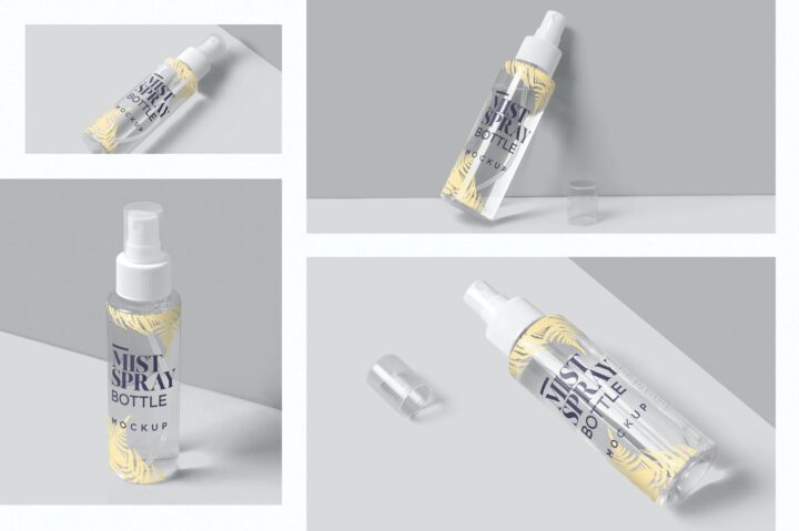 Produce outstanding presentations and product images of your bottle label designs using these clear mist spray bottle mockups. These mockups will show your design on the sticker label of transparent plastic spray bottle. You can also take help of its intelligent layers to customize the shadows, effects and background.