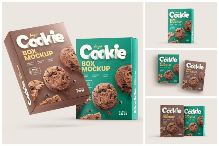 New Cookie Box Mockup Set with 5 scenes, 4k backgrounds, and trendy packaging designs. This mockup bundle includes a total of 5 packaging mockups that can use for cookies, biscuits, sweets, candy, and other food branding packaging designs.