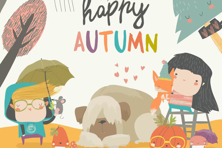 Autumn ,Fall, Children ,Vector, Meeting, Girl, Boy, Pumpkin ,Friendship ,Leaves, Friends ,Fir ,Rain, Umbrella ,Tree ,gfx