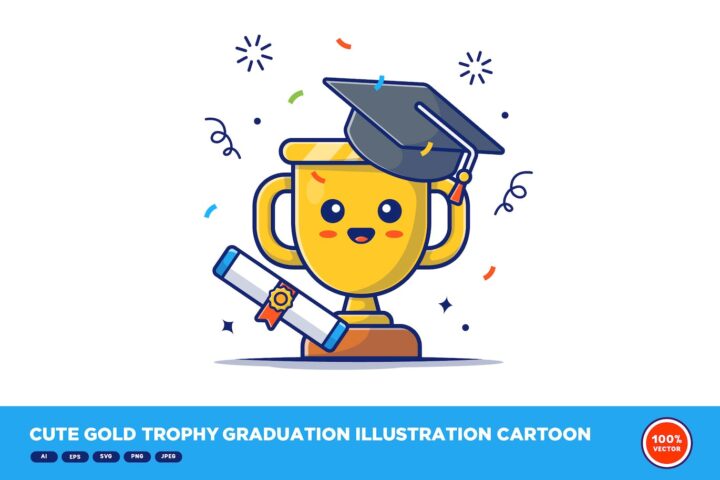 Graduation, Gold, Trophy, Cup, Certificate, Badge, Cute, Education, Vector, Icon, Illustration, Logo, Mascot, Character, Design,