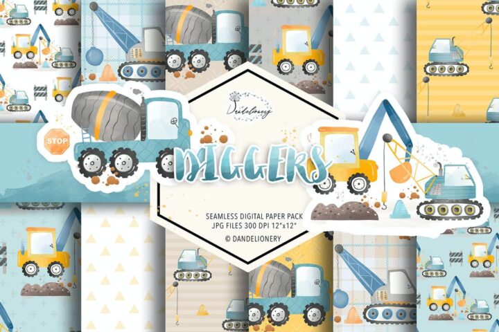 Watercolor ,Construction ,Diggers, Digital, Paper, Pack, Boy, Nursery, Pattern, Dump, Truck, Bulldozer, Vehicles, Excavator, Cement, gfx