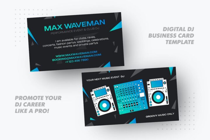 Creative Digital DJ business card psd template for Pioneer DJ / CDJ 3000 / Traktor DJ / producer. Suitable for all type of DJ: club dj, mobile dj, wedding dj, hip hop dj, digital dj, fashion dj etc. You can easy change text, fonts, colors and move all elements. Perfect for self promotion in club industry. Must have for all professional dj’s and musicians!