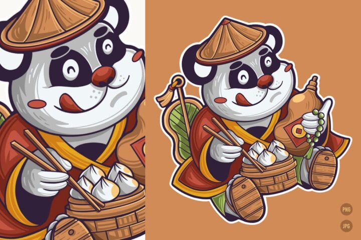 Panda, Chinese, Drunk, Dimsum, Food, Animal, Kungfu, Sticker, Illustration, Chop, Stick,
