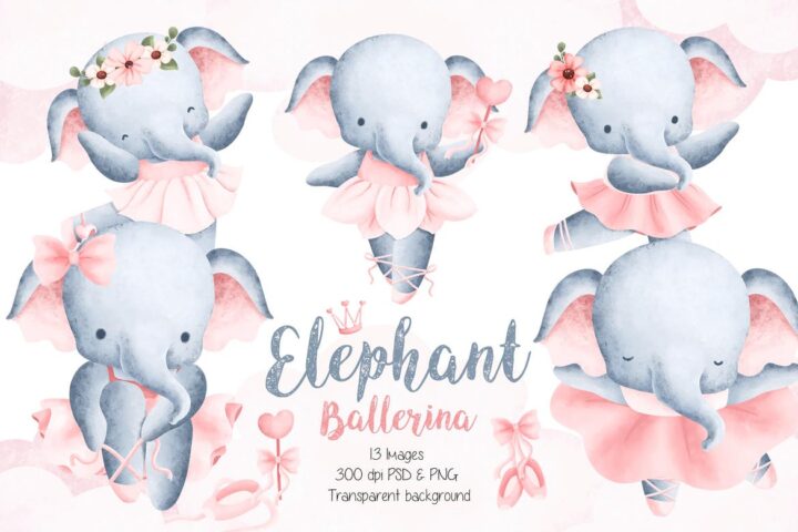 Elephant, Ballerina, Animal, Cartoon ,Ballet, Dance, Girl, Tutu, Watercolor ,Cute, Character, Dancer, gfx
