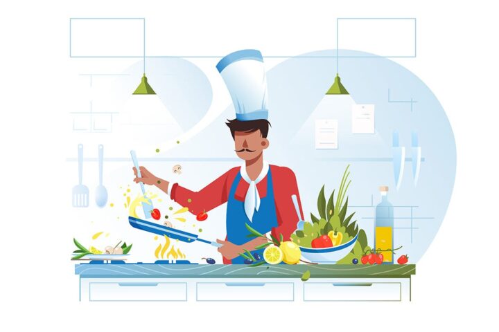 Flat young chef cooking vegetarian dish with olive oil. Concept restaurant food, healthy cafe. Vector illustration.