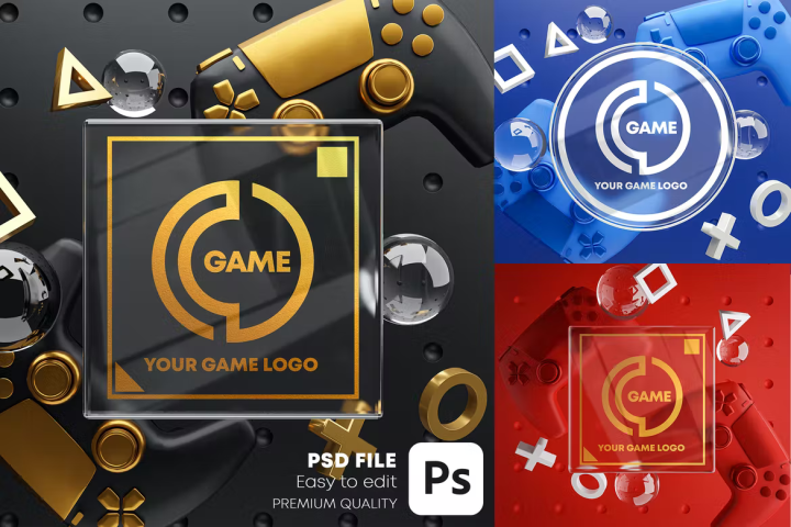 Logo, Game, Gaming, Glass, Playstation, Ps5, Mockup, Console, Joystick, Gamepad, Controller, Gold, Esport, Play ,Gamer, gfx