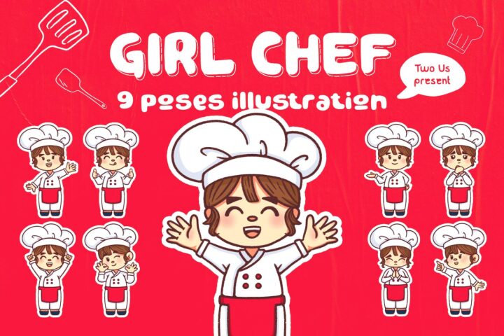 Girl Chef – Mascot Illustrations 9 poses of a girl chef for your design element or brand mascot!