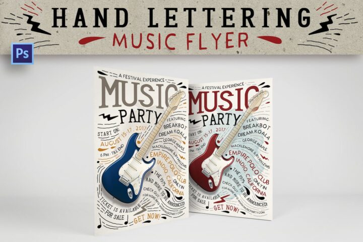 The PSD files are super easy to edit, you can change the color of the guitar, text, graphic images in 5 seconds. The used fonts are free. All layers are well arranged, grouped and color highlighted. In the package, you’ll get 2 flyers with different color palettes and the tutorial file, just so you can create your preferable color palette.