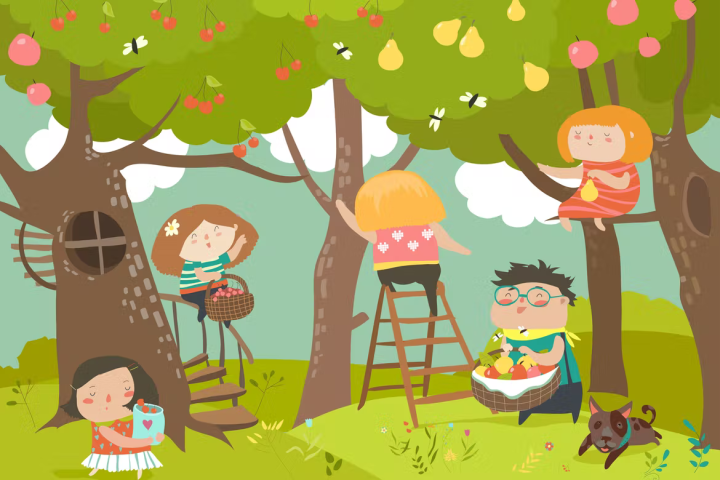 Summer, Harvest ,Kids ,Children ,Forest, Boy ,Cherry ,Girl ,Garden ,Tree ,Collecting, Character, Friends ,Apple ,Branch ,gfx