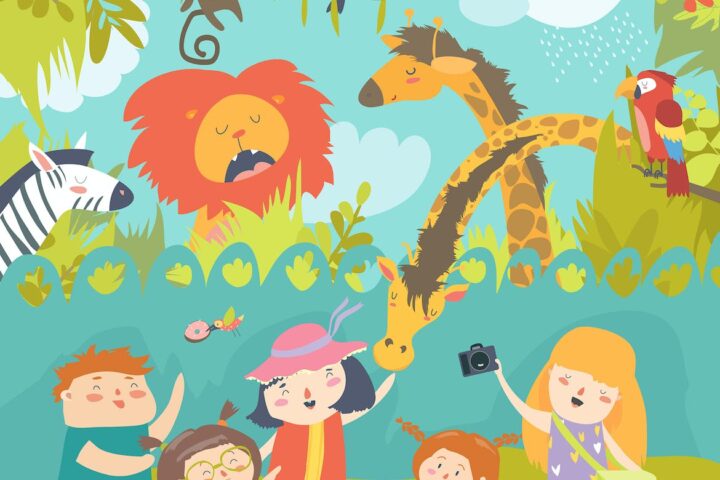 Zoo, Nature, Excursions, Children, Animals, Giraffe, Zebra, Lion, Monkey ,Parrot, Sky, Palm ,Summer, Kids, Savannah, gfx