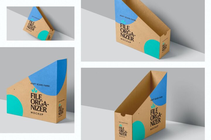 High resolution kraft box file organizer mockups to help you create realistic presentations of your file organizer designs. Offering separate smart object on each side of the file holder to add your branding designs. These mockups offer wall and floor background which you can easily customize using intelligent layers.