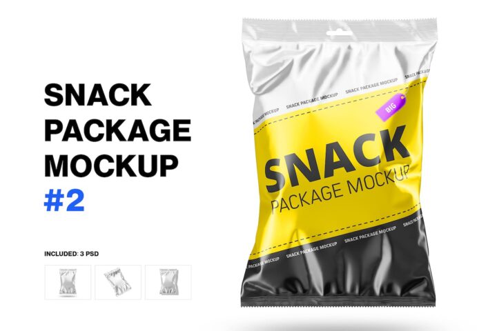 Set of 3 photorealistic and easy to edit Large Snack Package Mock-up’s for Photoshop.