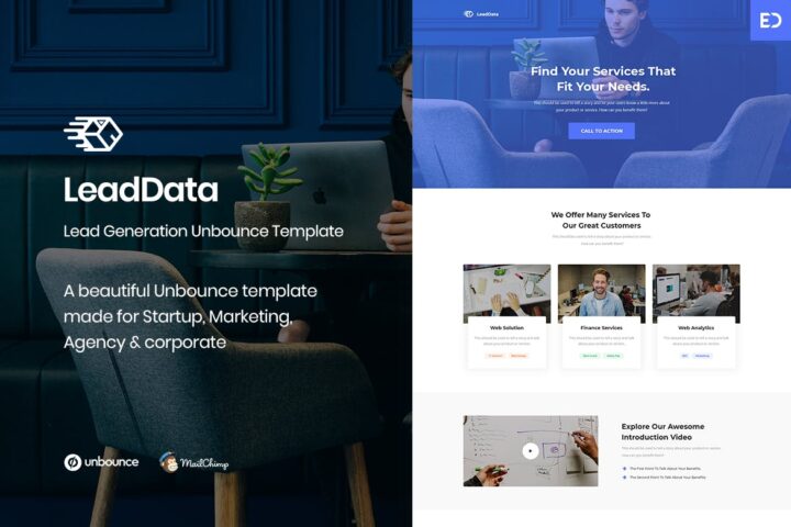 LeadData is a clean and modern Unbounce Template with focus on conversion, it can be used to promote your services, or even in any lead gen or click-through campaign. Source PSD’s are included for easy edition and customization. We hope you like it!