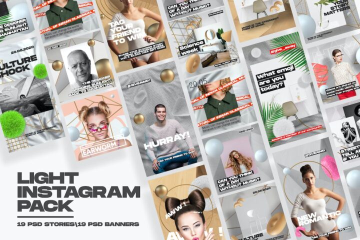 19 templates banner size (1080×1080) and 19 Stories size (1080×1920)