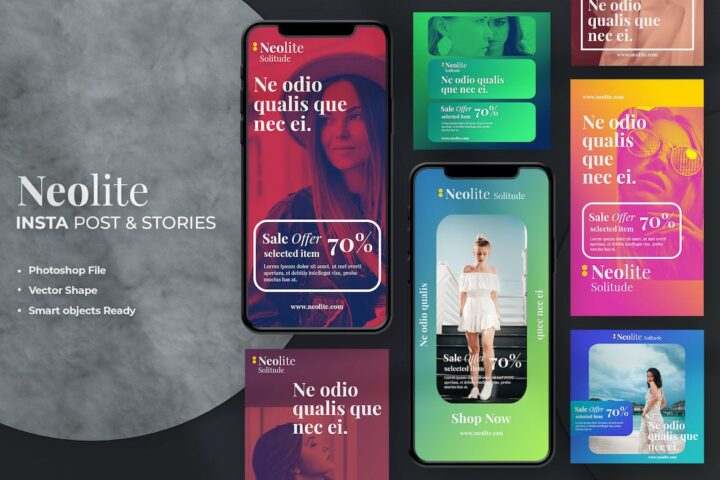 This is a Modern, Useful and Professional PhotoshopNeolite – Fashion Instagram Stories & Post Template that can be used for promotional purposes on your instagram. Perfect template to showcase fashion store, product, photography, artwork, food, Lifestyle and more. This item consist of 8 Design and optional size Square or potrait size that fully editable and customizable.