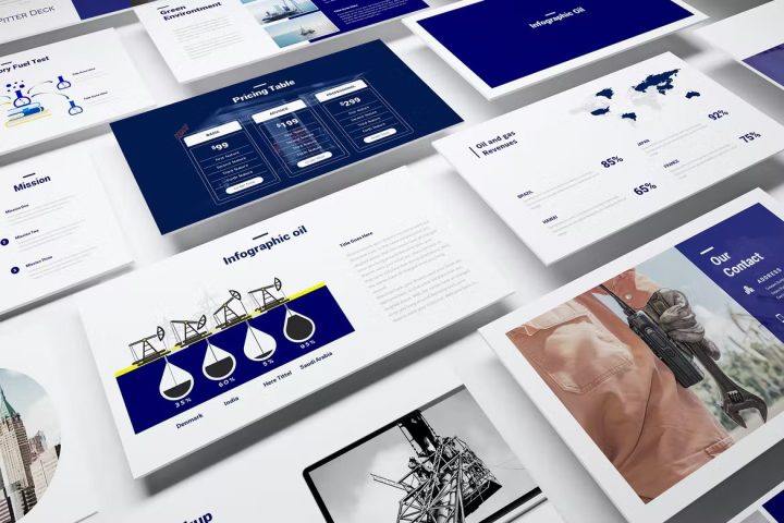 Oil and Gas Keynote Template come with 90 unique slides flat blue design, clean, minimalist and modern presentation. Content of section (introduction, team, portfolio, services, maps, infographic etc.).