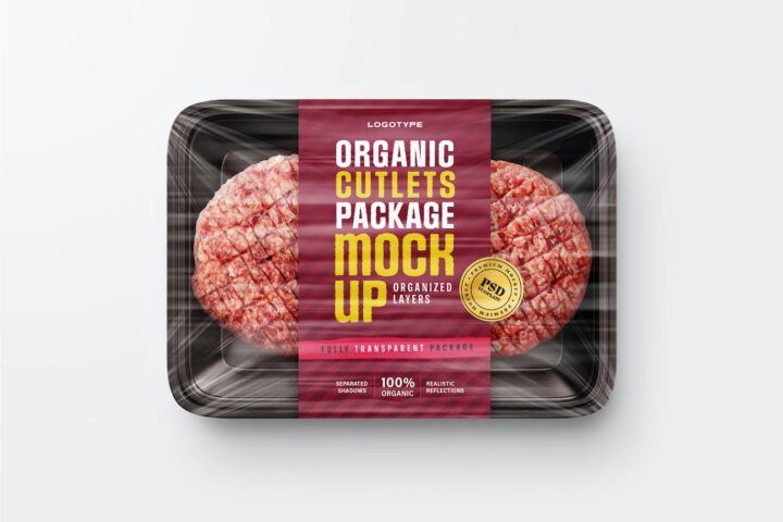 Organic Cutlets Package Mockup Set with 2 scenes, 4k backgrounds, and trendy transparent packaging designs. This mockup bundle includes a total of 2 packaging mockups that can use for the market, restaurant, organic shop, butcher, meat brand, and other food branding packaging designs.