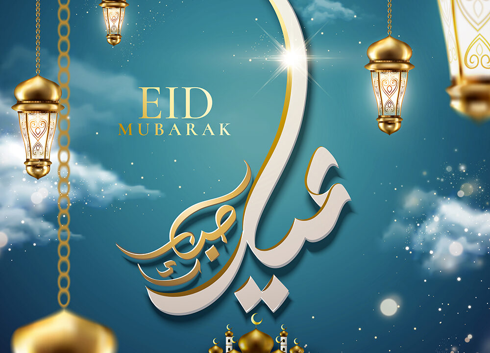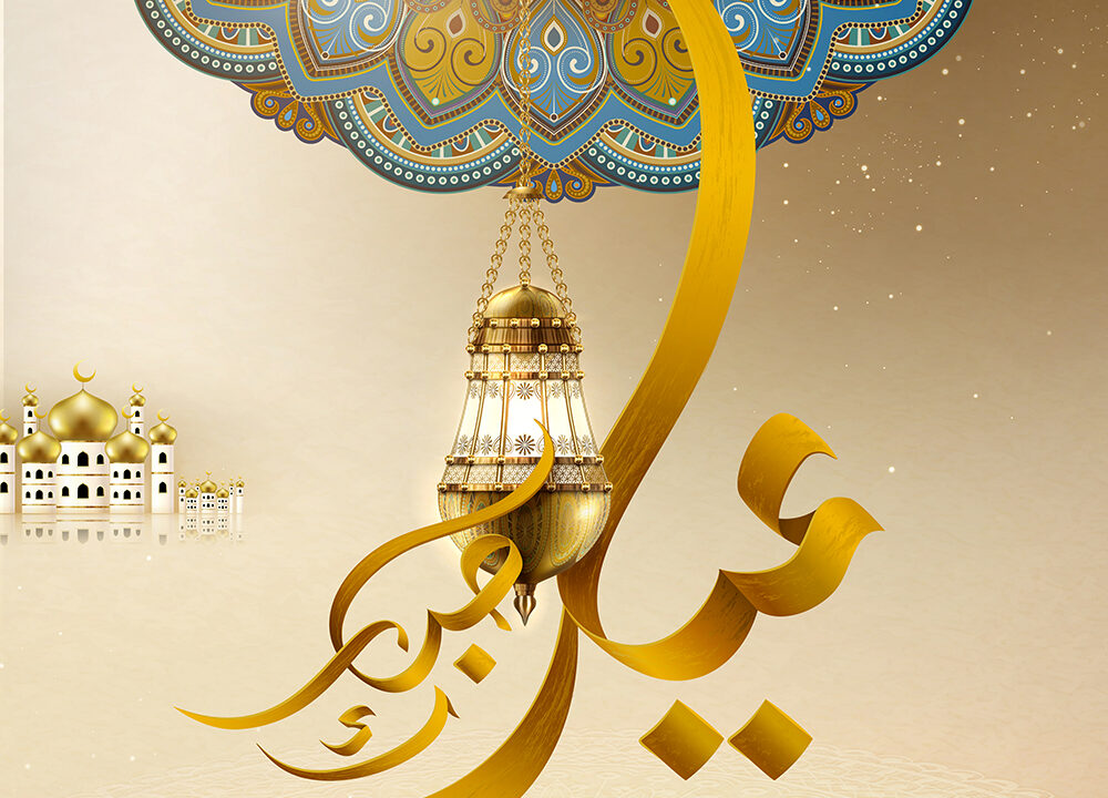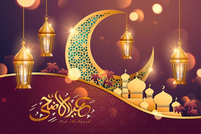 eid mubarak golden calligraphy with purple arch hanging lanterns decorations happy holiday written arabic