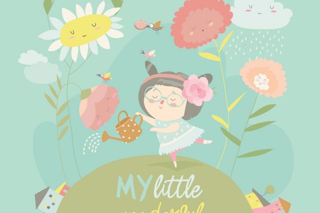 Pretty girl watering flower. Vector cartoon
