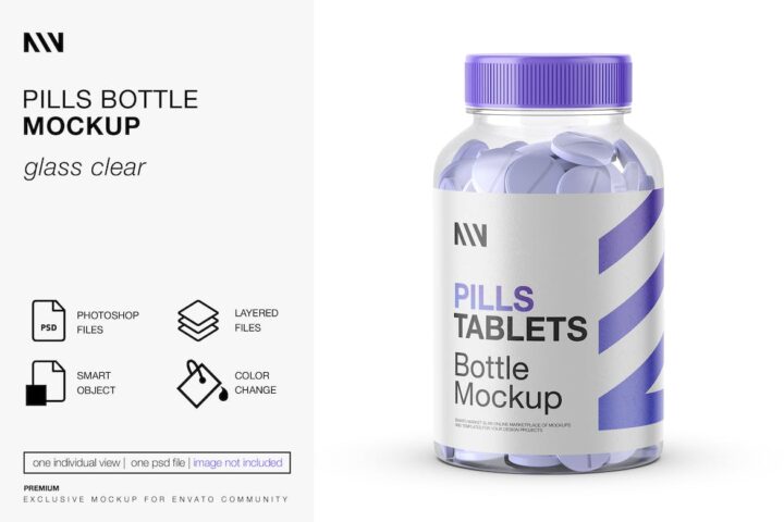 Present your design with this “PILLS BOTTLE” Mockup (Glass Clear) befrore printing. The file includes seperate layers for the color objects and background. Smart layer for the label helps to apply your design. Premium quality and simle to use.
