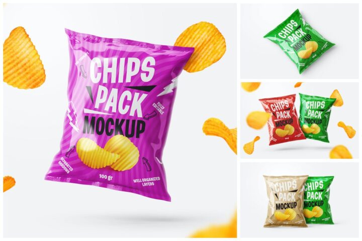 Grab this gorgeous new Potato Chips Packaging Mockup Set with 4 scenes, 4k backgrounds, and trendy packaging design. This mockup bundle includes a total of 4 packaging mockups that can use for snack branding design and snack packaging design.