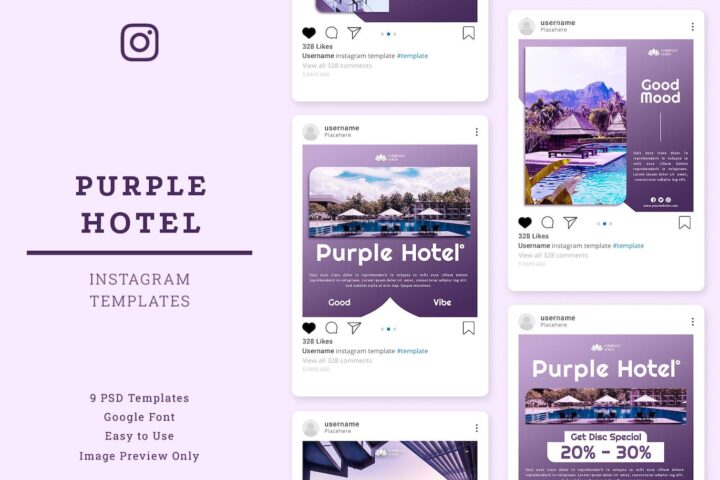 Amazing instagram Post template for Your Business Promotions. A bundle of Purple Hotel Instagram Template, build in Psd and easy to modify. The color tone that we choose is to represent Luxury, Glamour, and Expensive. We use display serif font to give it a modern but luxury looks. File include 9 Psd Instagram Templates, Removable pictures, Easy to change colors, Illustration in Smart Object.