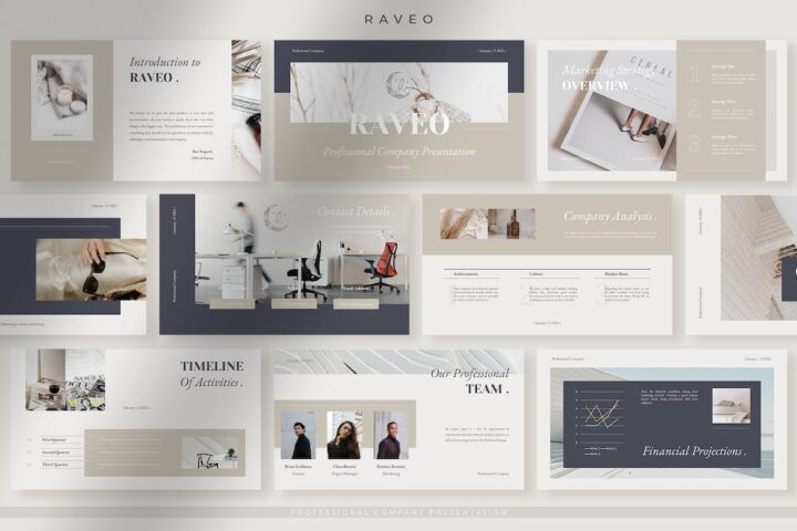 To gain the best, you have to give the best. It also applies in the business world, where you will get the best by presenting the best in you. Especially when you want to collaborate or cooperate with other parties, showing your best qualities is a must. You can start by showing what you have in your best company presentation using a proper and eye-catching template like Raveo, an elegant professional company presentation template. This template is perfect for company profile, marketing kit, business offer, and more in your company, corporate, start-up, professional, entrepreneur, and other businesses.