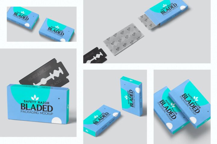 These Razor Blade Packaging Mockups set comprises of 5 different PSDs that include razor blade and its packaging box to showcase your branding designs. You can adjust the design of the blade box easily via smart object option. These mockups also include well-organized layers to personalize the light effects, colors, shadows and background.
