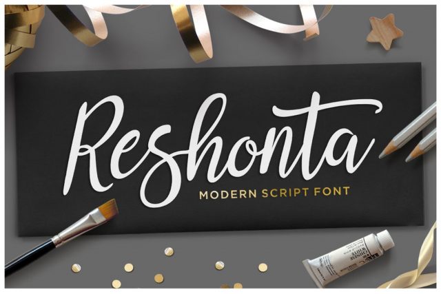 Reshonta Script is a hand-brushed modern calligraphy script font, created with both pen & brush. dancing baseline with lowercase alternates. Were painted on paper. scanned, vectorized and carefully made into a font.