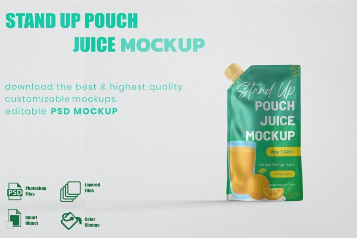 Stand Up Pouch Juice Mockup – layered, editable .psd files prepared to showcase your custom design, by editing smart objects and color layers.