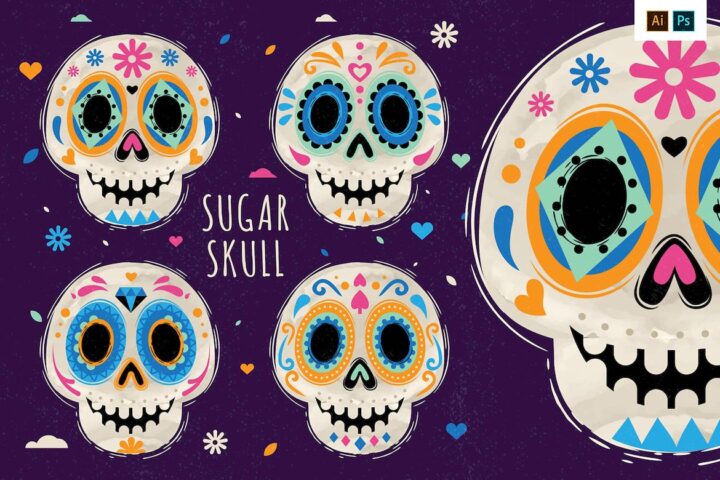 Here we have a fun & playful cartoon-style set of Mexican Calaca illustrations, aka “Sugar Skulls”.