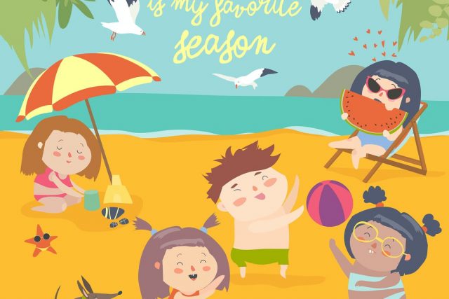 Summer childs outdoor activities. Beach holiday. Happy childhood. Vector illustration. Happy boys and girls on the sea.