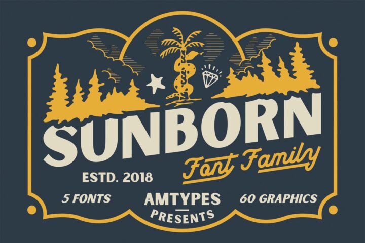 • Sunborn Script • Sunborn Sans One • Sunborn Sans One Slant • Sunborn Sans One Outline • Sunborn Sans One Outline Slant • 60 Graphics Pack